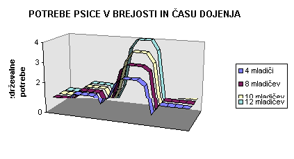 Je že res, da potrebuje žival v brejosti (še posebej pa kasneje, ko doji mladiče) večjo mero hranilnih snovi, vendar danes žal vse več lastnikov pretirava z nakupi najrazličnejših vitaminskih in mineralnih dodatkov. Zagotovo to storijo z najboljšimi nameni, vendar pa je učinek teh "čudežnih pripravkov" največkrat prav nasproten. Najenostavneje in najbolje je žival hraniti s kakovostno popolno hrano za doječe in breje psice, saj takšna hrana vsebuje vse potrebne hranilne snovi, tudi vitamine in minerale. S prilagojeno prehrano moramo pričeti najkasneje s petim tednom brejosti, ko prično zarodki hitreje rasti, potrebe psice pa strmo naraščajo. Primerna oskrba je pomembna tudi za doseganje kakovostnega mleziva - prvega mleka, ki daje zaščito novorojenim psičkom. Pri prehrani z neustreznimi beljakovinami in premajhno količino vitaminov (predvsem vitaminov E in B) bo mlezivo vsebovalo premalo protiteles za ustrezno zaščito mladičev. Potrebe psice v celotnem obdobju brejosti in času dojenja prikazuje grafikon 2. Kot je razvidno, žival v prvih dveh tretjinah brejosti ne potrebuje prav nič večjega dnevnega obroka kot pred brejostjo. V zadnjem obdobju brejosti pa plodovi rastejo zelo intenzivno, zato moramo takrat psici ponuditi nekaj več kakovostne hrane.