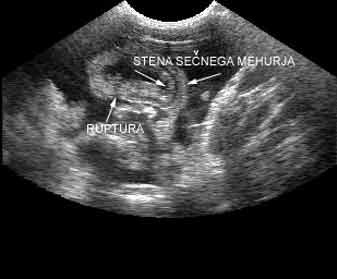 Z ultrazvočnim pregledom smo ugotovili, da je sečni mehur skoraj prazen, izven mehurja v trebušni votlini pa je nekaj proste tekočine. Glede na anamnestične podatke, smo posumili, da je morda sečni mehur počen. Z natančnim pregledovanjem mehurja smo ugotovili, da je na hrbtni strani mehurja stena prekinjena. Slika prikazuje pogled na sečni mehur. Dobro je vidna stena sečnega mehurja, ki je prekinjena; okrog mehurja pa prosta tekočina. |
