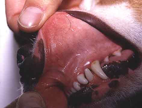 S punkcijo trebuha smo ugotovili, da je v trebušni votlini urin. Psica se zaradi tega, ker ni mogla odvajati urina po naravni poti le s tem zastrupila. Posledica zastajanja urina v telesu je zastrupitev s toksičnimi produkti presnove. Prišlo je do t.i. uremije, ki se kaže z znižano telesno temperaturo, bruhanjem in pojavom uremičnih ulkusov (razjed) na sluznicah. Z biokemičnimi preiskavami smo ugotovili štirikratno zvišanje sečnine nad normalo. Na sliki je vidna uremična razjeda na robu ustnične sluznice. |