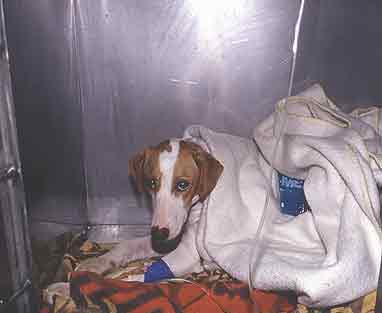 Počen mehur smo morali sešiti, vendar smo zaradi uremije (avtointoksikacije) morali psico najprej stabilizirati oz. odpraviti uremijo, z nemenom da bi rizik anestezije zmanjšali na najnižjo raven tveganja. Psici smo v trebuh vstavili dren, da je urin iztekel, poleg tega pa smo jo segrevali in aplicirali velike količine infuzij. Po enem dnevu intenzivne nege smo ugotovili, da se je raven sečnine spustila na normalno vrednost in smo psico zato operirali in sečni mehur sešili. Psica smo še za tri dni vstavili urinski kateter. Naslednji dan po operaciji se ji je vrnil apetit in smo jo zato odpustili v domačo oskrbo. Slika prikazuje psičko približno eno uro po uspešni operaciji. |