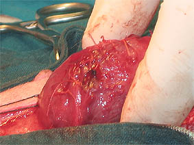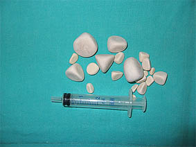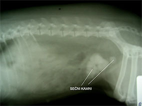 Fotografije prikazujejo primer sečnih kamnov v mehurju izjemne velikosti pri 9 let stari psički pasme nemški pritlikavi špic. Lastnik je psico pripeljal na pregled, ker je opazil oteženo in pogosto uriniranje (dysuria, polakisuria). Psica pred obiskom ni nikoli imela težav s sečili. S paplpacijo abdomna smo ugotovili v področju mehurja rezistence in posumili na sečne kamne, ki smo jih z rentgeniziranjem tudi potrdili. Psico smo pred kirurškim posegom temeljito preiskali in ugotovili še holosistolični šum na srcu, ki je simptom okvarjene mitralne srčne zaklopke. Z rentgeniziranjem prsnega koša nismo ugotovili pljučnega edema in smo se zaradi tega skupaj z lastnikom dogovorili za takojšnjo operacijo. Po operaciji smo psici pustili urinski kateter v mehurju še tri dni, predpisali antibiotično terapijo in ustrezno dijeto za preprečevanje nastajanja sečnih kamnov.