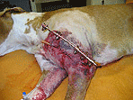 Po enem mesecu so psa pripeljali na kontrolni pregled. Povedali so, da pes nogo skoraj normalno uporablja in da se je iz ran cedilo približno tri tedne. Ves ta čas so psu nogo vsakodnevno previjali. |