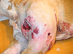 Pred operacijo smo operacijsko polje obrili, da smo odstranili dlake, poleg tega pa smo rano izdatno izpirali s fiziološko raztopino z namenom, da bi odstranili čimveč poškodovanega in odmrlega tkiva ter dlak. | |
