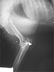 Na fotografiji rentgenograma je lepo viden zlom nadlahtnice, ter večji in manjši delci izstrelka. Na "srečo" krogla ni poškodovala sklepa, ker bi v nasprotnem primeru pes ostal trajni invalid, saj mu zdrobljenega sklepa skoraj gotovo ne bi mogli sanirati. | |